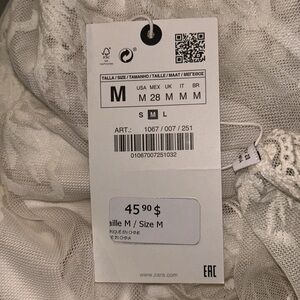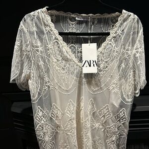 Delicate lace overlay with floral motifs. Short sleeves and V-neckline. Light ivory hue throughout. Feminine and elegant style. Easy to pair for events. Brand new with tags. Loved this but doesn’t fit.