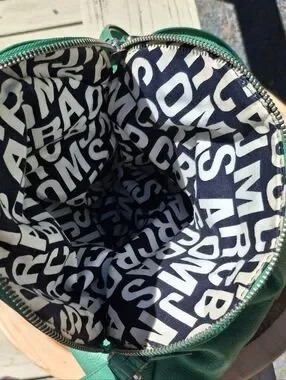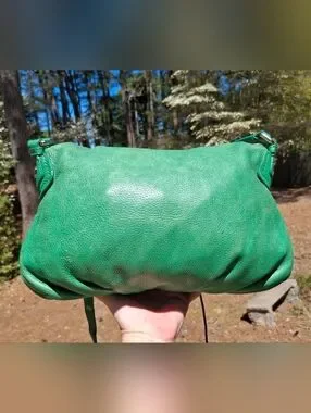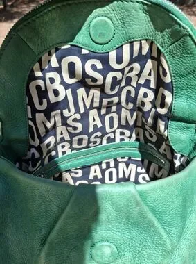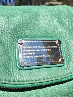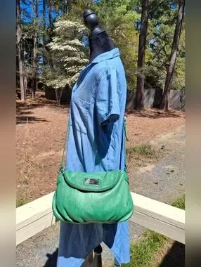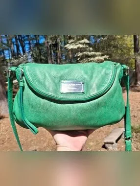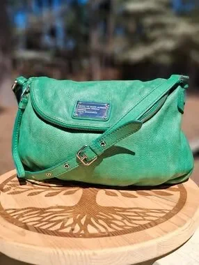 Pre-owned Marc by Marc Jacobs emerald green leather Classic Q Natasha crossbody or shoulder bag. Features one interior zip pocket, two interior slip pockets, zip compartment on flap, silver tone hardware, adjustable shoulder strap, and hidden magnetic closure. Measures 12×9×3.5 with a strap drop of 20 to 24 inches. Has general wear/distressed throughout. Interior has ink stain at the bottom. Exterior bottom has faint blue spot from ink.