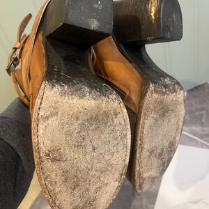 Classic tan leather ankle boots with decorative strap and buckle accents. Side zip for easy on and off. Versatile tan color pairs well with casual and dress looks. Comfortable low heel and rounded toe for everyday wear. One back heel shoes some marks, see pictures.