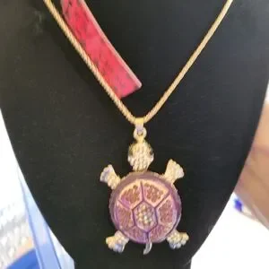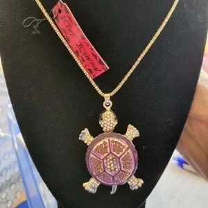 This Betsey Johnson necklace showcases a whimsical turtle pendant adorned with a pink mosaic shell and gold-tone accents. The intricate design is complemented by a simple gold-tone chain, making it a standout piece in any jewelry collection. Perfect for adding a touch of charm and elegance to your ensemble.