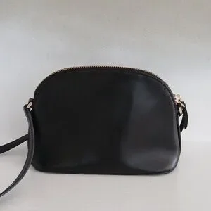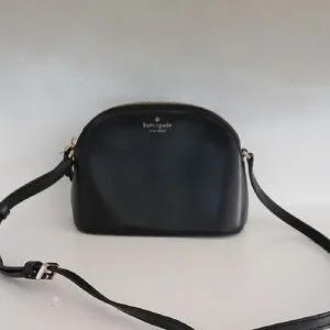 Sleek dome-shaped crossbody by kate spade. Smooth black leather exterior. Gold-tone zipper and logo details. Adjustable leather strap for easy wear. Polished and versatile for everyday use.