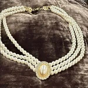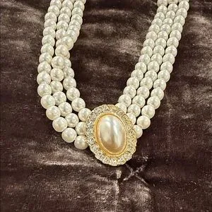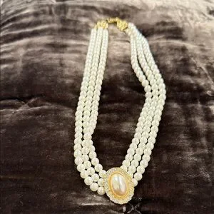 Three-Strand Faux White Pearl Necklace with Gold Rhinestone Oval Clasp