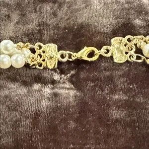 Chic three-strand white pearl necklace featuring a gold-tone oval clasp accented with sparkling rhinestones. The white pearls and gold clasp create a polished, feminine look perfect for special occasions or elevating everyday outfits. 16 inches long.