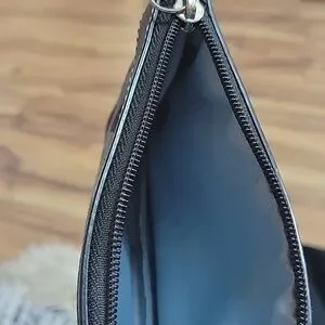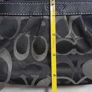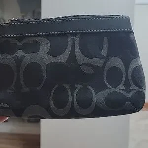 Coach wristlet in black signature jacquard. Zip-top closure. Lightweight and versatile. Iconic Coach logo embossed on trim.