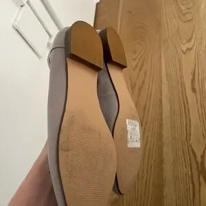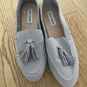 Suede loafers with decorative tassels. Soft light gray upper with stitched detailing. Cushioned insole for comfort. Slip-on style for easy wear.