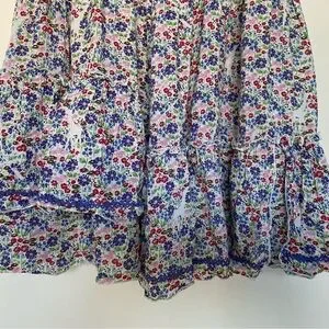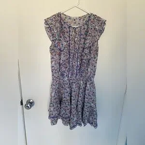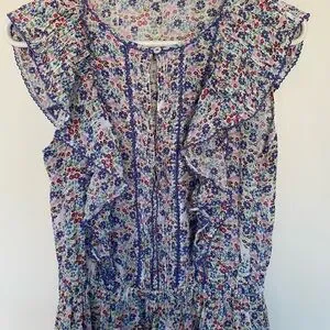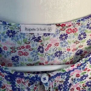 Excellent worn condition, Poupette St. Barth Bambi Mini Dress Swim Cover-up, size small. Color is listed as Blue Jardin. Dress has round neckline with button at keyhole front, pullover style, ruffle trim, and tiered skirt. It’s missing the fabric care tag, but it’s 100% viscose. No rips or stains. Please let me know if you need any measurements!