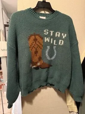 Teal knit crewneck sweater with a playful cowgirl boot and horseshoe graphic.