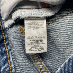 Light blue denim jean shorts with a frayed hem and classic five-pocket styling.