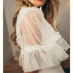 A romantic white tiered tulle dress with delicate ruffle sleeves. Lightweight, sheer layers create soft volume and graceful movement. Perfect for special occasions and elegant evenings.