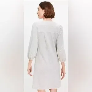 An inverted pleat shapes this pretty soft knit dress with an irresistible kick of flare. V-neck. 3/4 blouson sleeves with puff shoulders.