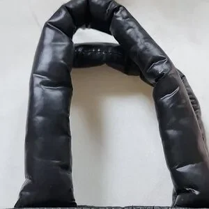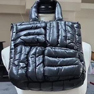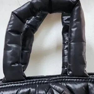 Stylish black quilted puffer tote made from glossy, padded fabric. Lightweight and soft with a comfortable top handle. Versatile design that complements casual and urban looks. Black color offers a sleek, modern finish.