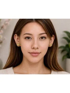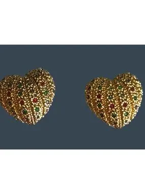 Beautiful vintage Nina Ricci heart-shaped clip-on earrings featuring a rich gold tone textured design accented with red and green rhinestones. Classic designer style with a bold, dimensional look that stands out beautifully.