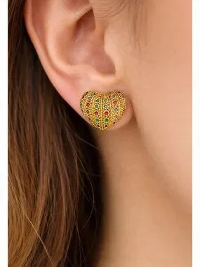 Nina Ricci Gold Tone Heart Clip On Earrings Red Green Rhinestones 1"
