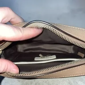 Preowned in excellent condition. Classic Henri Bendel mini camera crossbody in a versatile neutral beige pebbled leather with gold-tone hardware.