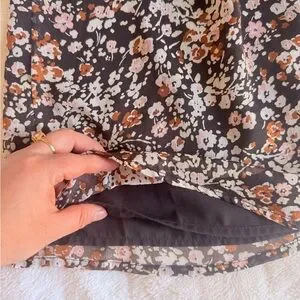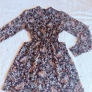 Sheer long sleeves with elastic cuffs. High neckline and subtle waist cutouts. Flowing skirt with all-over floral print. Lightweight, feminine silhouette for day or night.