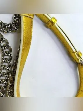 Strap: Adjustable silver-tone chain-link strap with a gold leather shoulder pad; versatile for shoulder or crossbody wear.