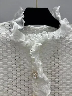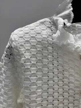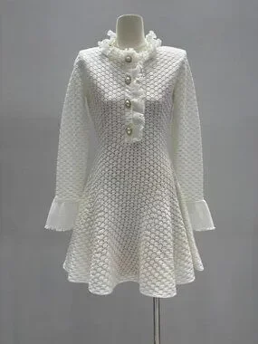 Gorgeous Self-Portrait mini dress made from a lovely white textured open-knit fabric with a subtle grid pattern. It features a romantic ruffled frill collar, a vertical row of four ornate pearl buttons with gold trim down the front, long fitted sleeves ending in ruffled cuffs, and a fitted waist that flares into a playful A-line mini skirt. The fabric has a delicate openwork texture, adding a feminine touch. Condition: Gently worn, no stains or tears.