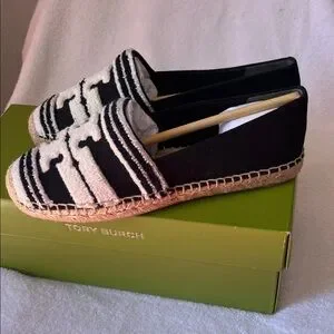 Tory Burch Black and Natural Stripe Espadrille Slip-Ons