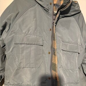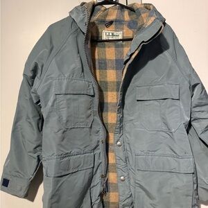 Sturdy hooded field jacket by L.L. Bean. Water-resistant outer shell with multiple front flap pockets. Full zip and snap storm placket. Plaid fleece lining for added warmth. Versatile for outdoor wear.