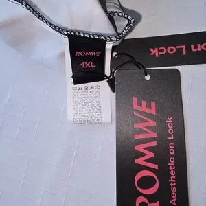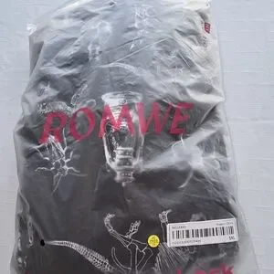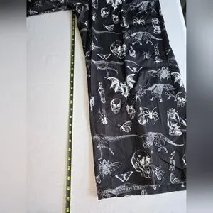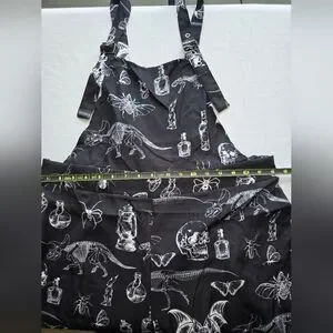 Romwe overall-style jumpsuit with adjustable shoulder straps. Black fabric with white gothic and insect motifs. Front bib and roomy side pockets. Relaxed, long silhouette for layered looks. Easy to style for casual or alternative outfits. Skeletal apothecary