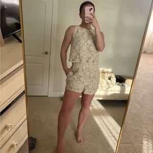 Sleeveless crochet tank with coordinating high-waist shorts. Intricate floral openwork throughout. Lightweight and breathable for warm weather. Easy to pair with sandals or layered pieces. Size XS but can fit a 2/4 just fine!