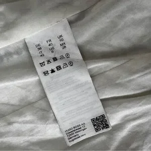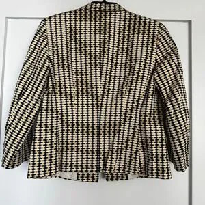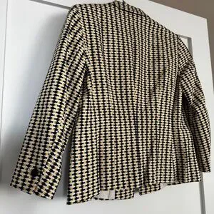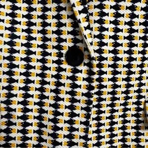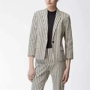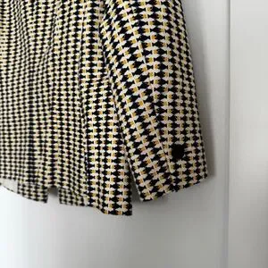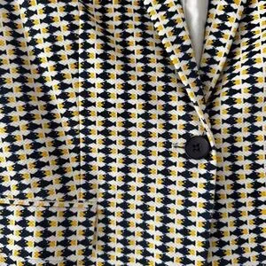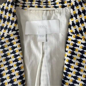 Classic Hugo Boss blazer with navy and yellow fish pattern. Single-button front with notched lapel and 3/4 sleeves. Tailored silhouette for a polished look. Versatile piece!