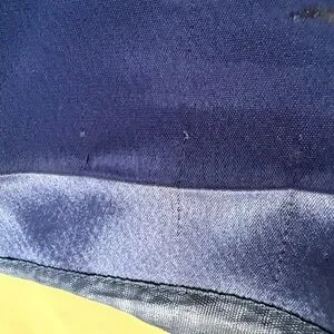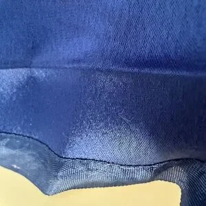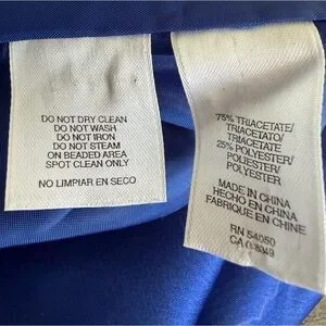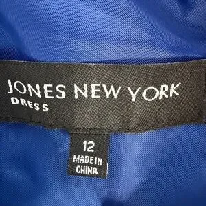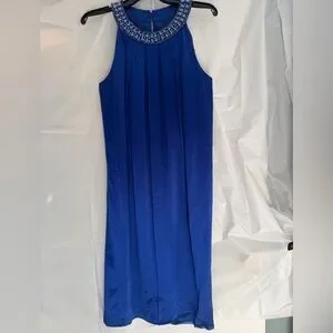 Sleeveless Jones New York midi dress in vivid cobalt blue. Vertical pleats create a sleek, lengthening look. High neckline with gorgeous jewelled neck. Smooth, flowing fabric for effortless wear. Slight mark at hem. Also, the hem was either started to be let down or fallen down.