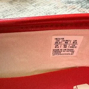 Shiny red satin Mary Jane flats by Onitsuka Tiger by Asics. Double-strap design with scalloped cream trim. Soft cushioned footbed for comfort. Sporty sole with feminine detailing.