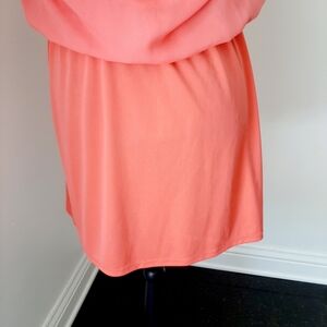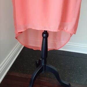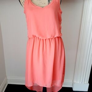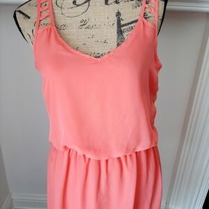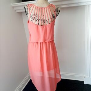 Giani Bini GB coral colored dress with high low hem. Strappy detail back with high low hem line. Elasticized waist.