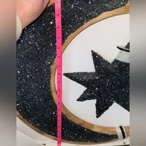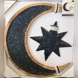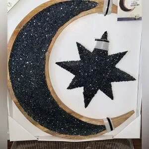 Sparkling crescent moon and star wall accent. Black glitter finish with wood frame. Ready to hang. Eye-catching celestial decor.