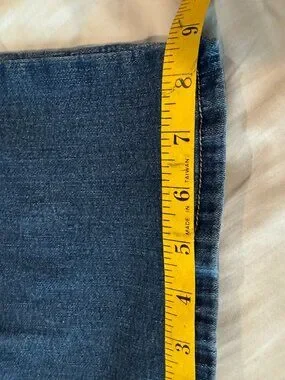 These jeans measure like a Petite size 10. The flat waist measures 15", and the inseam measures 27", with a mid-rise cut. Please check measurements to ensure the best fit.