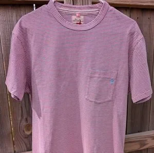 Soft striped short-sleeve pocket tee in pink + green. 100% Cotton, extremely soft, worn a few times