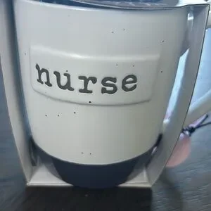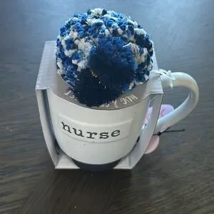 Ceramic Sheffield Home mug labeled "nurse." Comes with a textured blue and white pom pom lid. Simple, gift-ready design. Fits a healthcare professional theme.
