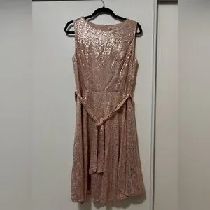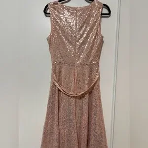 Crew neck sleeveless A Line rose gold sequin dress, perfect for any special occasion.