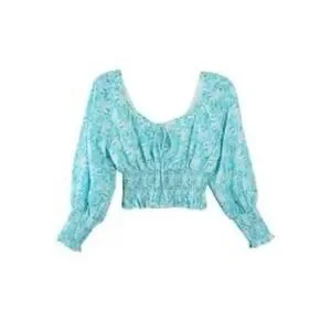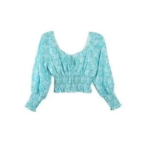 rixo london crop top smocked waist floral blouse aqua blue square neck long sleeve puff sleeve cottagecore romantic feminine boho summer top high waist pairing resort wear vacation outfit euro summer lightweight blouse elastic waist cropped top flattering fit feminine blouse trendy soft girl coastal style
