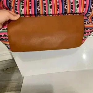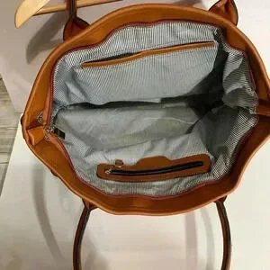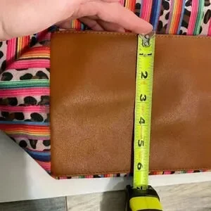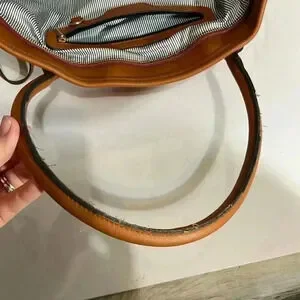 Used there are flaws on the handles the edges of the leather strap came off so I trim the thread. There are two marker marks on the inside of the purse. There is a scuff mark on the bottom of the bag and the leather on one handle attached to the bag has a small pull on the thread. This is a very fun and vibrant purse with a lot of life left that will catch other people’s eye.