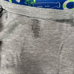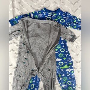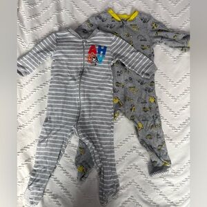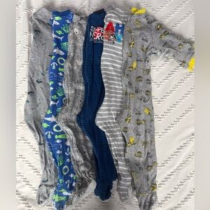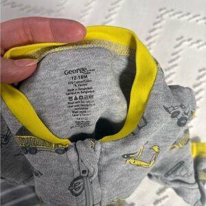 Lot of George footed one-pieces in mixed prints. Colors include gray, blue, and yellow accents. Assorted designs: vehicles, sea life, stripes, and character patches. Soft knit fabric with full-length zips. Cozy cuffs at wrists and feet.