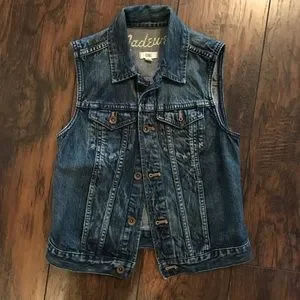 Madewell sleeveless denim vest in a classic blue wash. Durable cotton construction with button-front closure and chest pockets. Versatile layering piece that pairs easily with dresses or tees.