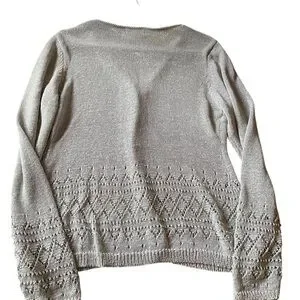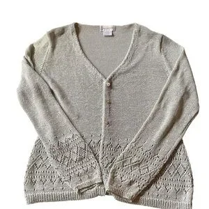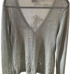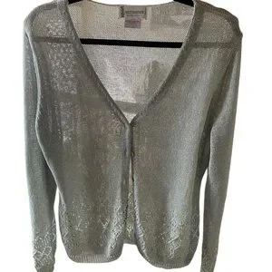 Light green V-neck cardigan with delicate openwork hem and long sleeves. Light knit with a flattering slightly fitted silhouette. Versatile layering piece that pairs easily with casual or dress looks.