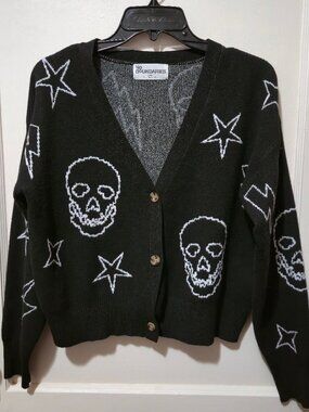 - Button-up sweater featuring a graphic print of white skulls, stars, and lightning bolts.