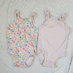Two sleeveless cotton bodysuits. One features an all-over pastel floral print. The other is a soft light pink with a small bow at the neckline. Snap closures at the crotch for easy changes. Lightweight and breathable for everyday wear.