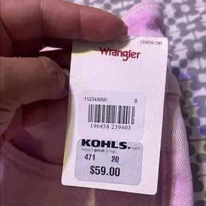 Wrangler women's denim shorts in a soft pink wash. Classic five-pocket styling with a frayed cutoff hem. Casual fit that pairs well with tees and sandals. Lightweight, summery look.