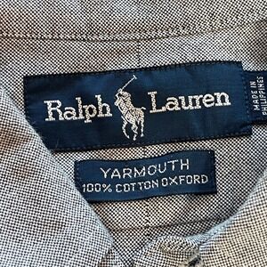 Ralph Lauren Yarmouth Oxford button down shirt. This classic gray long sleeve shirt features the iconic embroidered pony logo on the chest and a traditional button-down collar. Its versatile style makes it perfect for casual outings, office wear, or smart-casual events.