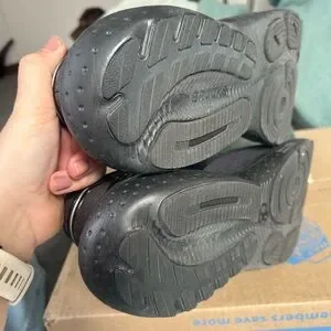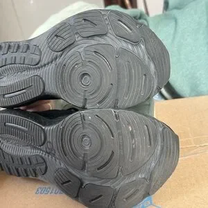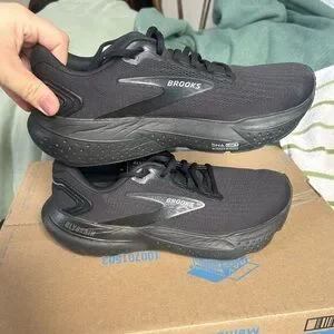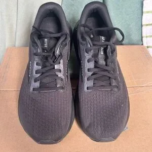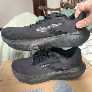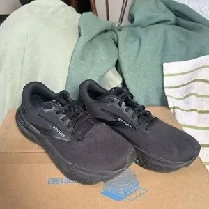 Sleek all-black running shoes by Brooks. Breathable mesh upper. Padded collar and tongue for comfort. Durable rubber outsole for traction. Subtle branded side detailing. 10 D