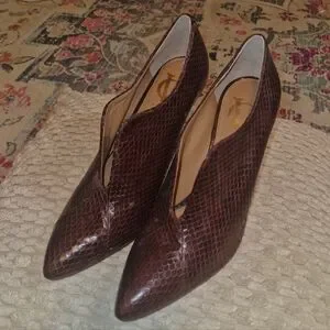 Sleek pointed-toe ankle heels in a textured snakeskin pattern. Slip-on style with a low-cut vamp for a modern look. Smooth interior for comfortable wear. Versatile brown tone that pairs with dressy or casual outfits.