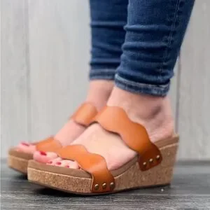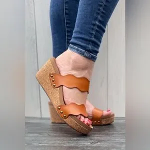 Corkys Footwear Obviously cognac brown Scalloped Double Strap Wedges