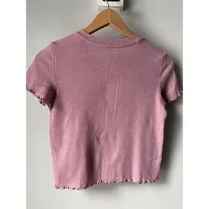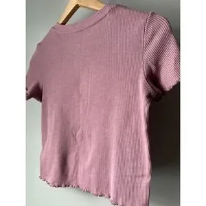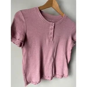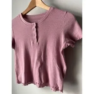 Dusty rose ribbed henley t-shirt from American Eagle Outfitters. This top features a button-up neckline, short sleeves with lettuce hem detailing, and a coordinating lettuce hem at the bottom. Perfect for casual outings, layering, or a relaxed weekend look.