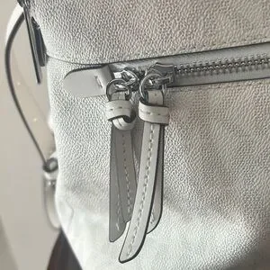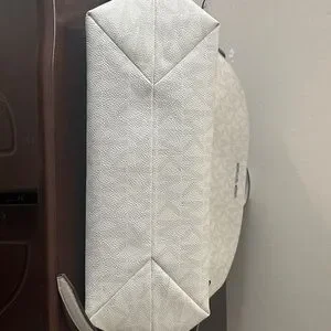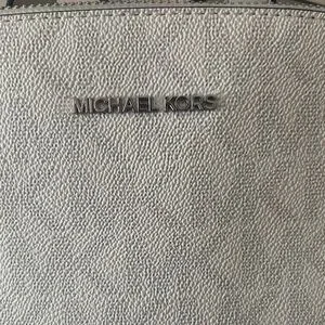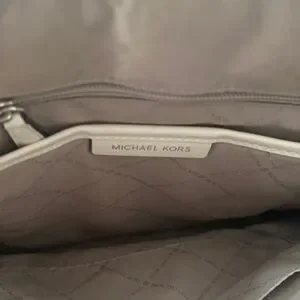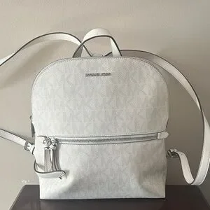 Sleek Michael Kors backpack in a soft cream tone. Front zip pocket and leather tassel pull. Top handle and adjustable straps. Subtle metallic logo on front. Clean silhouette for everyday wear.