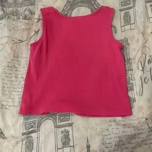 Bright hot pink sleeveless tank with bows on shoulder. Features a small embroidered palm tree and playful monkey graphic at the chest. Soft knit fabric for everyday wear. Cute and easy to style.