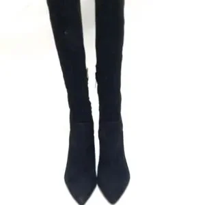 Classic knee-high silhouette. Black suede upper with pointed toe. Comfortable block heel for stable wear. Pull-tab at back for easy on. Sleek, versatile design.